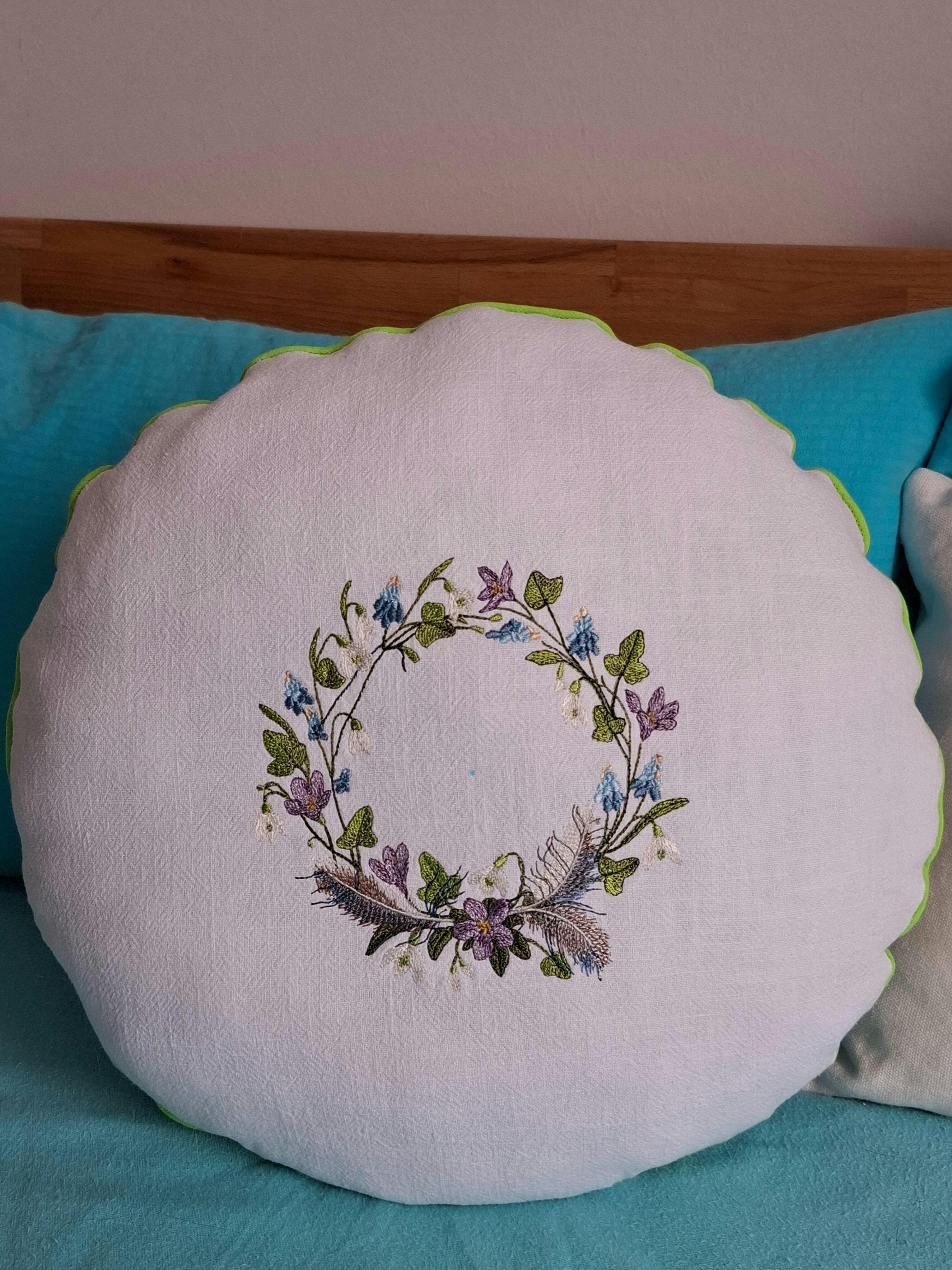 Zur Bestickung empfehle ich feste Leinenware mit hochwertigem, ausreichend stabilem Stickvlies, damit die vielen feinen Blüten, Linien und Federdetails sauber und plastisch zur Geltung kommen.